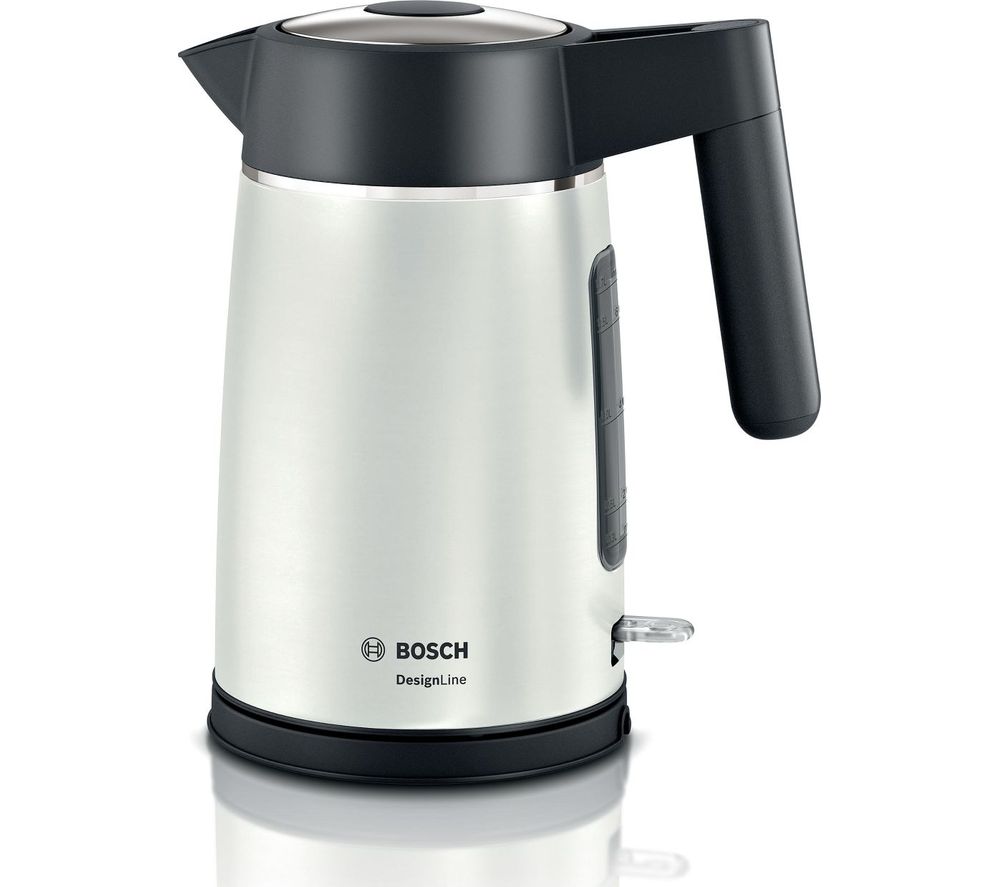 Large capacity Prepare tea for all your guests at once using the Bosch DesignLine TWK5P471GB Jug Kettle. Its generous 1.7 litre capacity is perfect when you’re making hot drinks for a crowd. It also has a large cup indicator, so you’ll know exactly know much water you need for the number of cups of coffee you’re making. Simply pop the spout under your kitchen tap for easy refilling, you can also open the lid at the touch of a button. Stylish design The TWK5P471GB’s elegant stainless steel design, with its 360° rotating base, will look fantastic in any kitchen. Plus, with the option to store the power cord in the base, you won’t have messy cables running across your kitchen counter. Safe and easy to use There’s no need to keep an eye on the kettle while it’s boiling – once the water is ready, the kettle will shut off automatically. Its Triple Safety feature also has overheat and boil-dry protection to keep you safe.