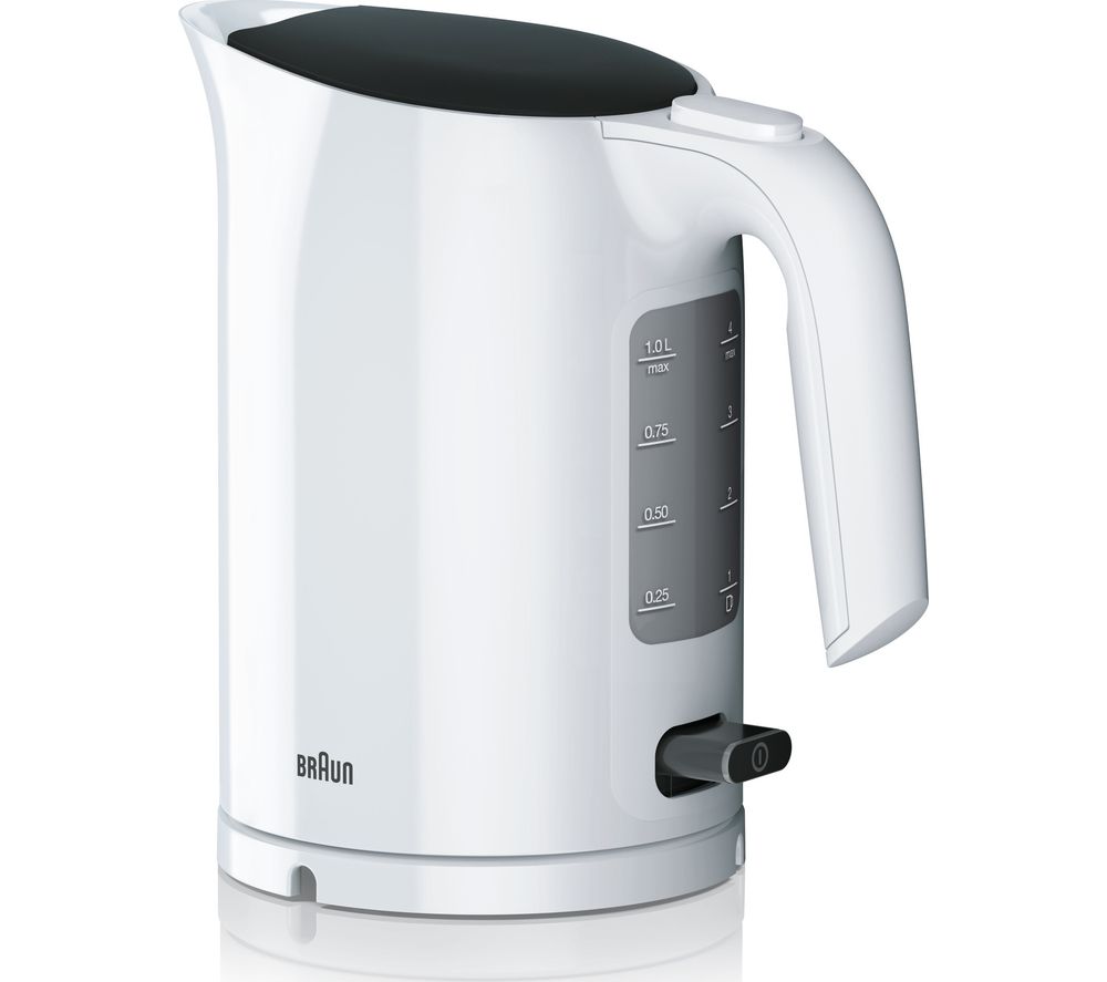 Prepare drinks for everybody with the Braun Series 3 PurEase WK3110.WH Jug Kettle.With a fast boiling system, you can enjoy a cup of tea in even less time, while the convenient handle and flip lid make it easy to carry and refill the electric kettle. A large water window lets you see how much water you’re using, and a three-way protection system keeps you and your home safe. The kettle automatically switches off when it is up to temperature or removed from the base, with boil-dry protection if there isn’t enough water inside.